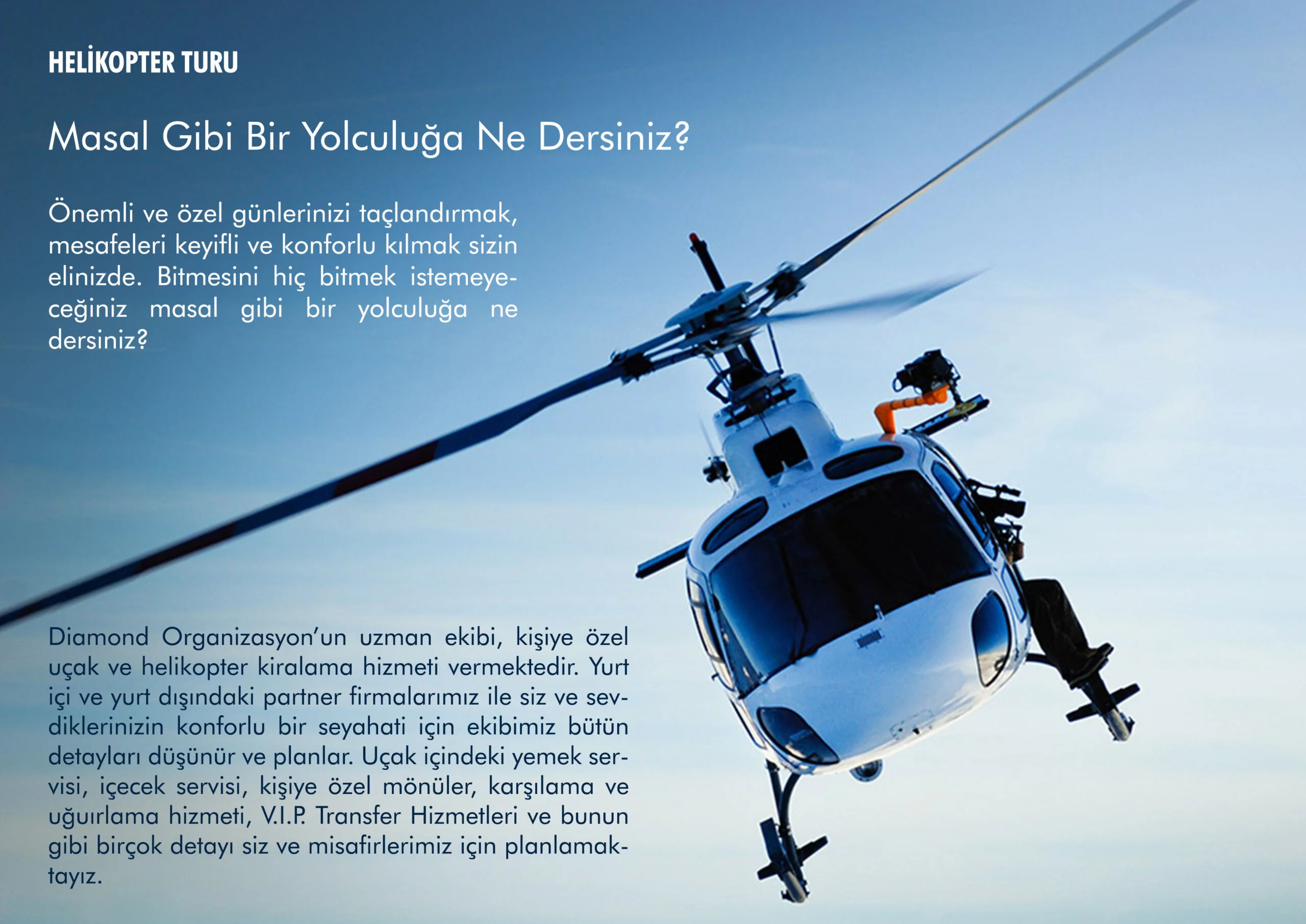 VIP ulaşım, iş ya da tatil amacı ile sık sık talep gören işlevsel bir ulaşım aracı olan helikopterler çok işlevli olması nedeni ile kusursuz bir şekilde ulaşım imkanı sunmaktadır. Kısa bir helikopter uçuşu ile trafiğe takılmadan gideceğiniz alana ulaşabilir ve zamandan tasarruf elde edebilirsiniz.